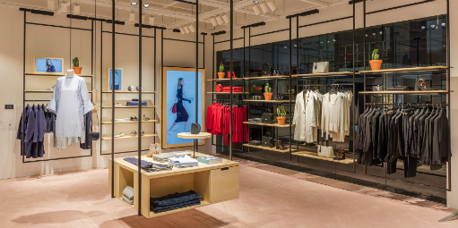 Na entrada da loja, os consumidores deparam com um enorme painel suspenso de LED, que reflete cores e texturas correspondentes às coleções da temporada.